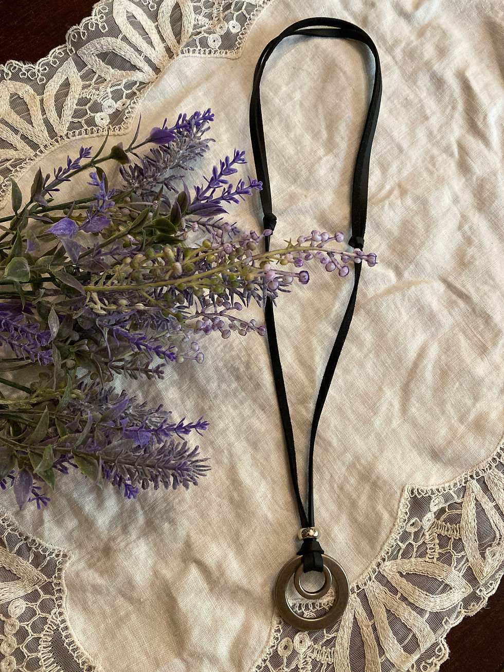 Long necklace with suede rope and wooden circle with silver metal design